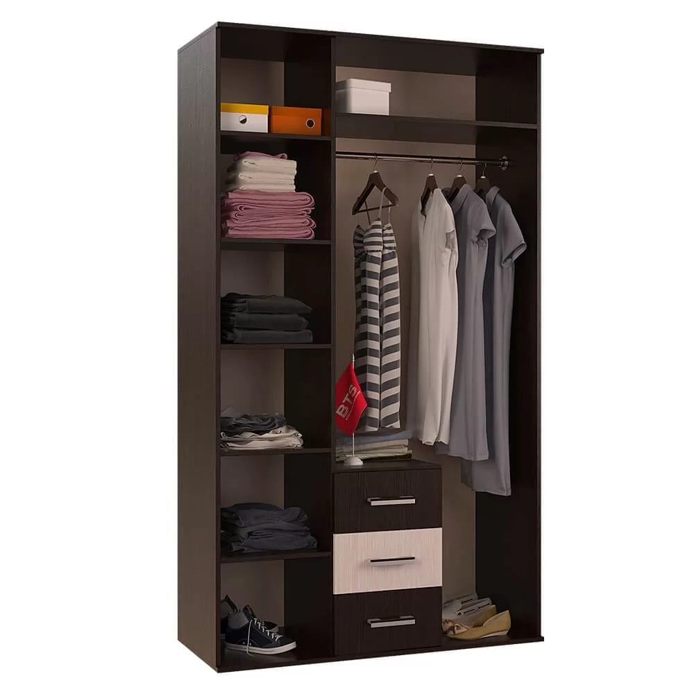 - модель имеет отделение с хромированной штангой для одежды на вешалках, три выдвижных ящика, а также зону с полками, - на центральный фасад прикреплено высокое зеркало, - изделие выполнено из ЛДСП в контрастных цветах венге и дуб аталанта, - изделие выполнено из ЛДСП в цвете ясень белый, дополнено эргономичными ручками, - модель дополнена эргономичными ручками.