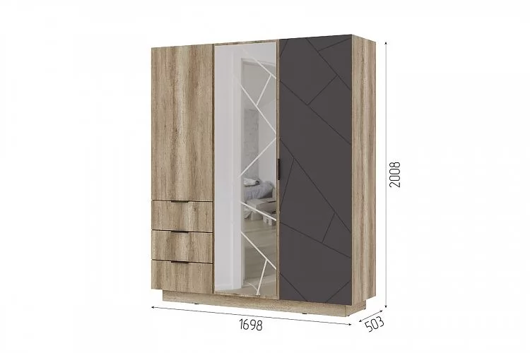 Высота, мм-2008Ширина, мм-1698Глубина, мм-503Вес, кг-145.3Расположение-УниверсальноеМатериал корпуса-ЛДСПМатериал фасада-ЛДСП, МДФ, зеркалоЦвет корпуса-КоричневыйЦвет фасада-Темно-серыйЦвет корпуса изготовителя-Дуб каньонЦвет фасада изготовителя-Дуб каньон, софт графитВид установки-НапольныйЗеркало-ЕстьКоличество дверей-3Количество зеркал-1Количество ящиков-3Полки-Есть