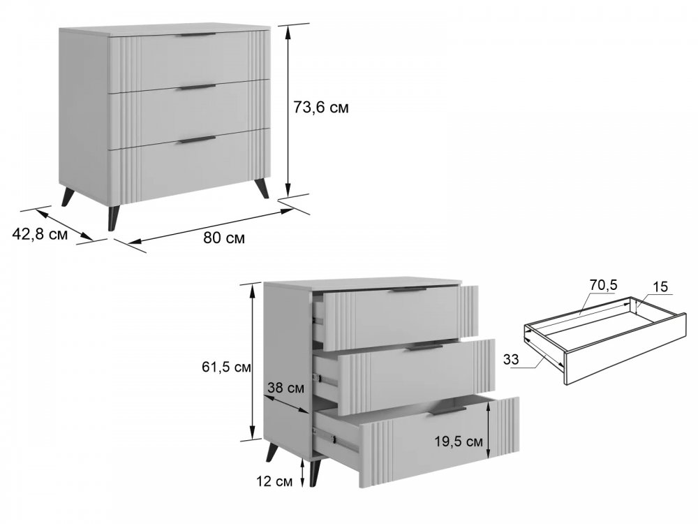 Комод изготовлен из качественных материалов: корпус выполнен из ЛДСП, что гарантирует прочность и долговечность, а фасад, выполненный из МДФ в плёнке ПВХ, не только выглядит эстетично, но и защищает комод от повреждений. Особое внимание заслуживает фрезеровка фасадов, которая придаёт изделию изысканный вид.