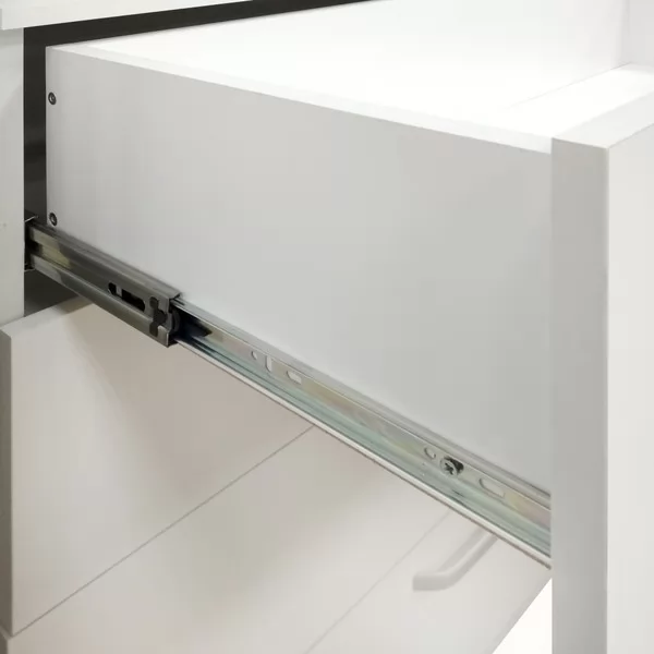 Выкатные ящики работают на шариковых направляющих полного выдвижения - тихих, надежных, позволяющих увидеть и использовать все пространство ящика.