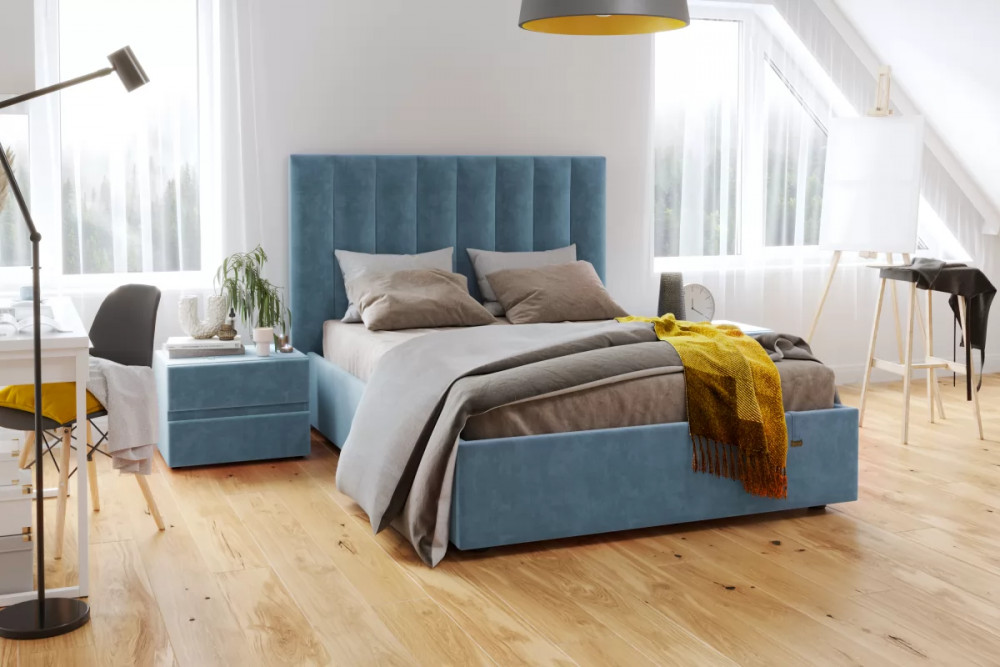 Кровать «Ingrid» подойдет для современных интерьеров спален, впишется в стиль ретро и скандинавский минимализм. Обивка будет отлично сочетаться с любыми цветовыми оттенками отделки и мебели. Кровати выполнены в нейтральных и ярких тканях велюр, что позволяет подобрать подходящий вариант почти под любой интерьер. Изголовье имеет прямоугольную форму, повторяя очертания кровати. Дизайн модели отличается высоким изголовьем с вертикальными строчками и углублениями.