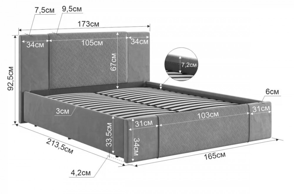 Для каркаса кровати предлагается два варианта комплектации: с основанием на опорах и матрасом на выбор, либо с основанием с подъемным механизмом, настилом и матрасом на выбор. Рекомендуемый размер матраса составляет 1600х2000 мм, что оптимально подходит для данной модели.