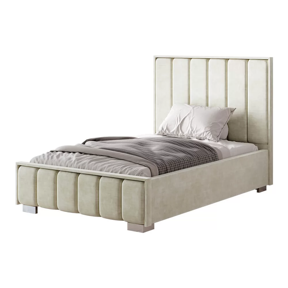 -изделие прекрасно будет смотреться в светлой комнате за счет кремового цвета велюра, используемого в дизайне, -корпус кровати изготовлен из высококачественной ЛДСП, -мягкое изголовье имеет вертикальные стяжки, что придает модели элегантности.
