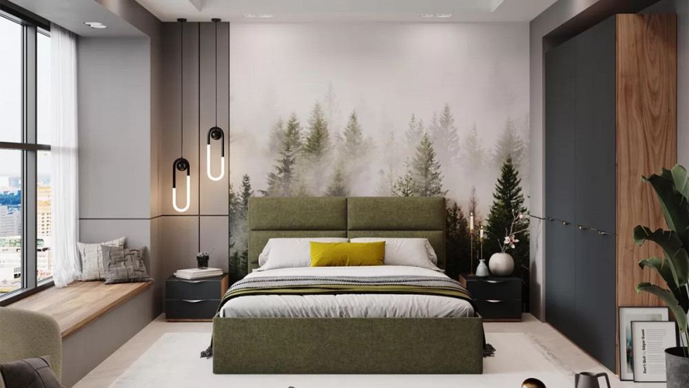 Спальный гарнитур «Глосс» №10 Яблоня Беллуно, Стекло Графит матовый, Микровелюр Jercy Deep Green в Пыть-Яхе