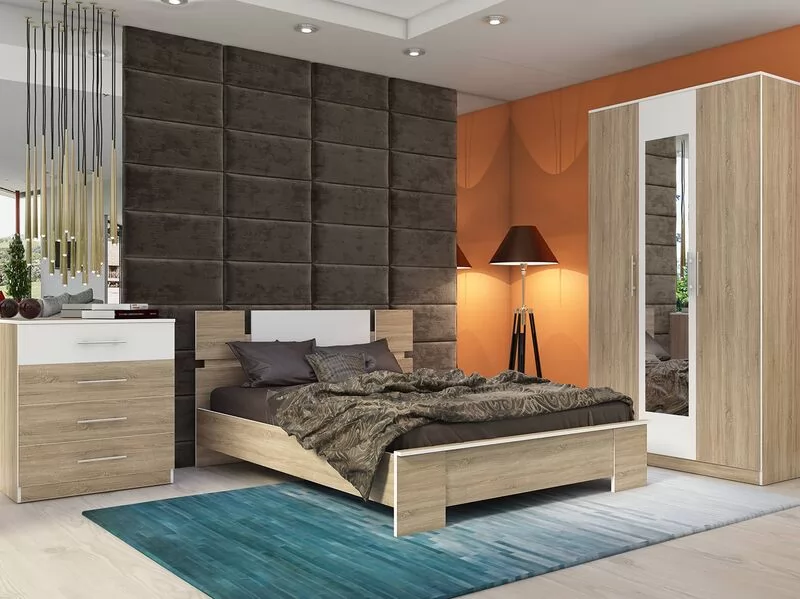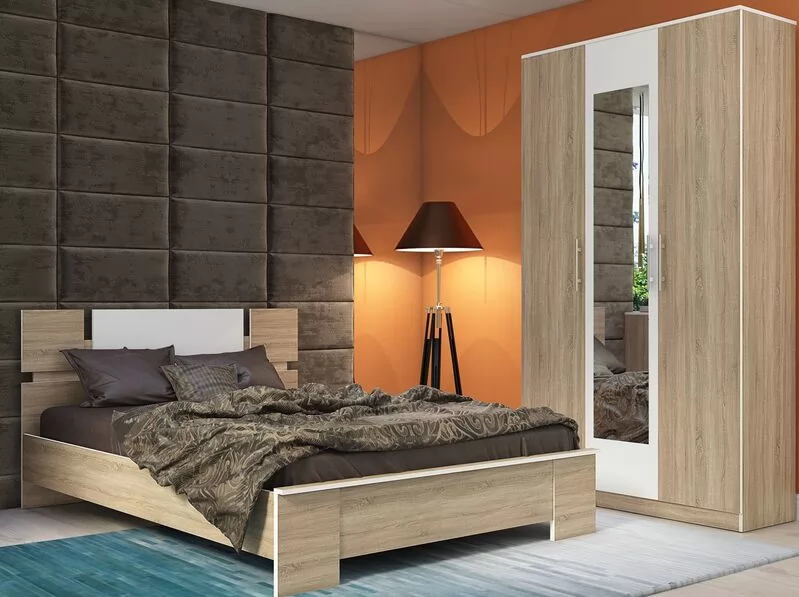 мм с изголовьем, трехстворчатый распашной шкаф с зеркальной панелью и вместительный комод