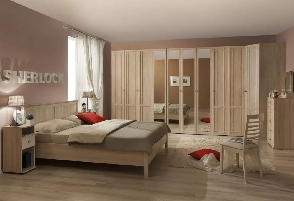 Спальня не музейный интерьер, поэтому здесь должно быть не только красиво, но и удобно. Дополнив еë шкафами из гостиной SHERLOCK, Вы позаботитесь о месте для хранения белья и одежды. Фасад модуля 10 (гостиная) Шкаф угловой выбирайте на свой вкус: с зеркалом или глухой с декоративной раскладкой.