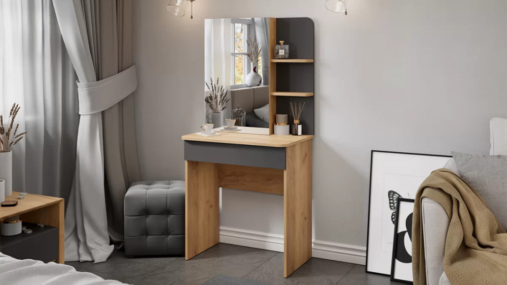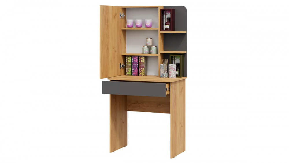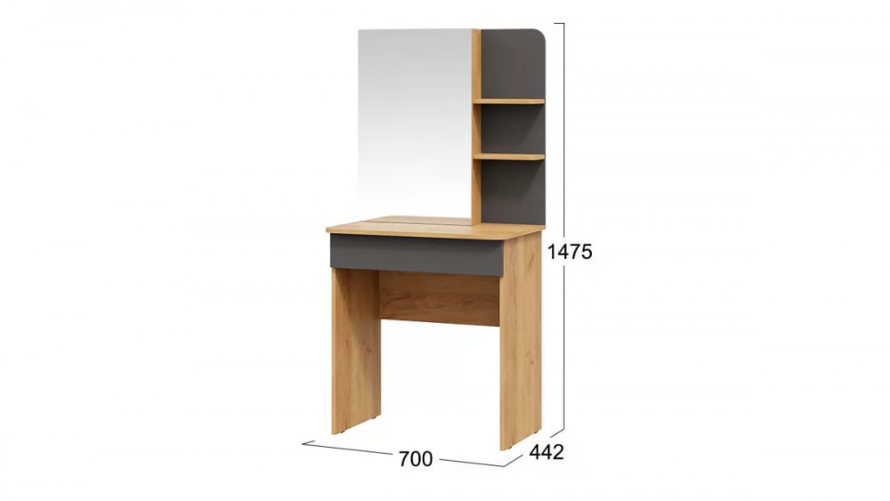 Назначение: Мебель для работы и приема пищи Отсек для хранения: Да Количество дверей: 1 Зеркало: Да Гарантийный срок: 24 месяца Комната использования: Спальня Материал кромки каркаса: ПВХ Стиль: Современный Тип: Туалетный столик с зеркалом Расположение: Напольный Тип направляющих ящиков: Шариковые Материал каркаса: ЛДСП Дополнительная информация: Размер зеркала 717х458 мм. Производство: Россия Габаритная ширина: 700 Габаритная высота: 1 475 Форма предмета: Прямоугольный Габаритная глубина: 442 Количество ящиков: 1 Модель: Майя Срок службы: 5 лет Материал фасада: ЛДСП Цвет: Дуб Крафт золотой, Серый графит Тип сборки: Не универсальный Наличие механизма раскладки: Нет Наличие спального места: Нет
